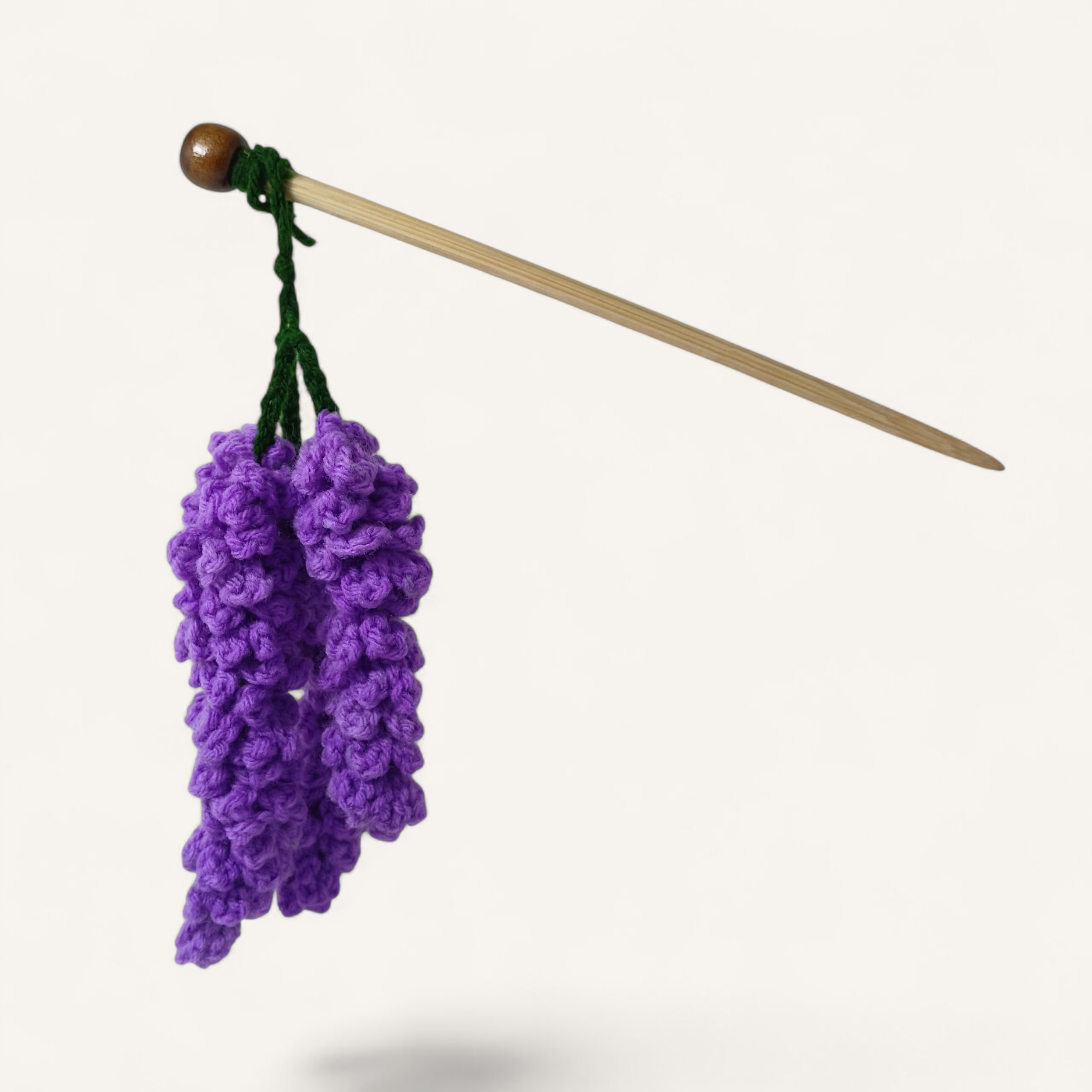 Each strand is meticulously crocheted to mimic the intricate texture of real wisteria, creating a stunning visual and tactile experience. The rich purple color is both eye-catching and versatile, complementing a variety of hair colors and styles. Whether you’re dressing up for a special event or simply adding a creative accent to your everyday look, this hair stick provides a secure and stylish way to hold your hair in a bun, twist, or updo.